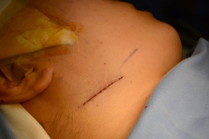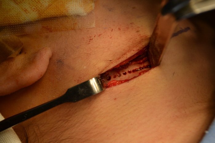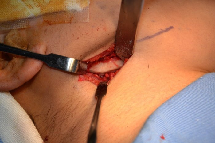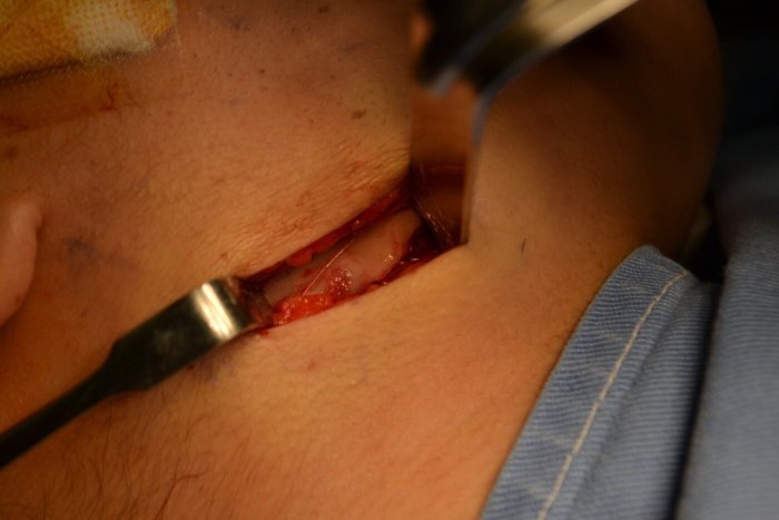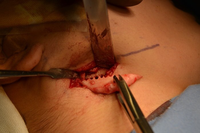 エラの外縁部の皮膚を3~4cm切開して、脂肪、筋肉を経て下顎骨に達します