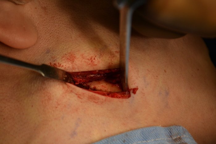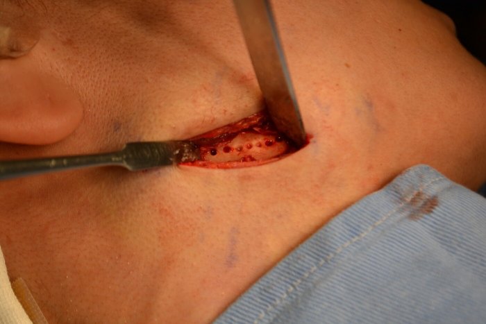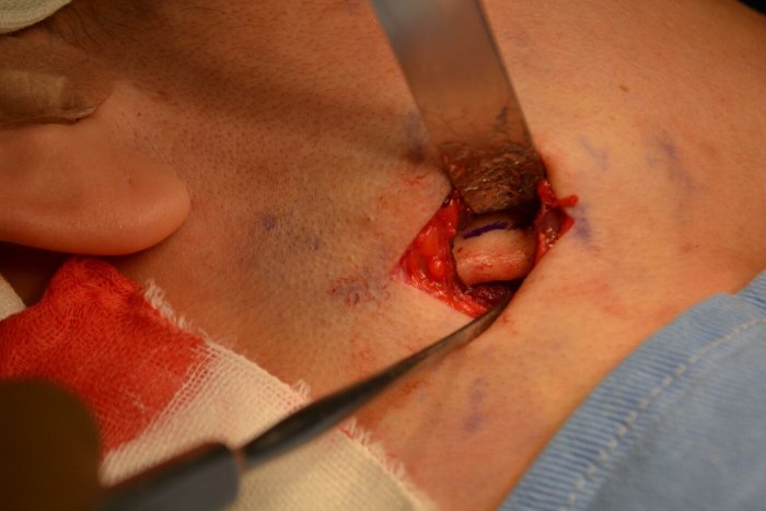 下顎角外縁部を3~4cm切開して、脂肪層、筋肉層、を経て下顎骨に達します