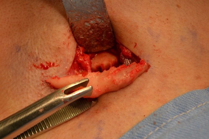 エラの外縁部の皮膚を3~4cm切開して、脂肪、筋肉を経て下顎骨に達します