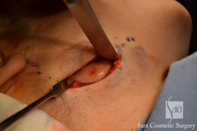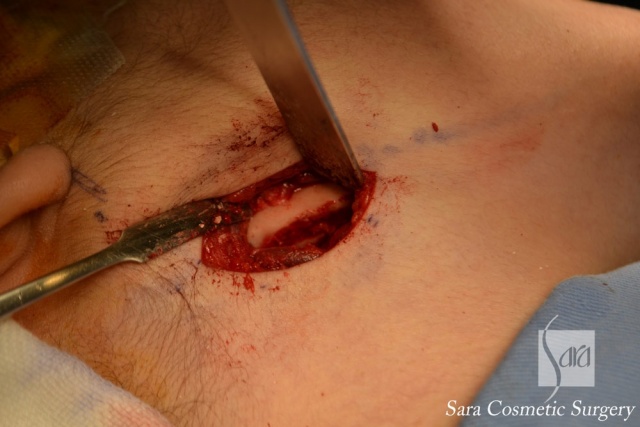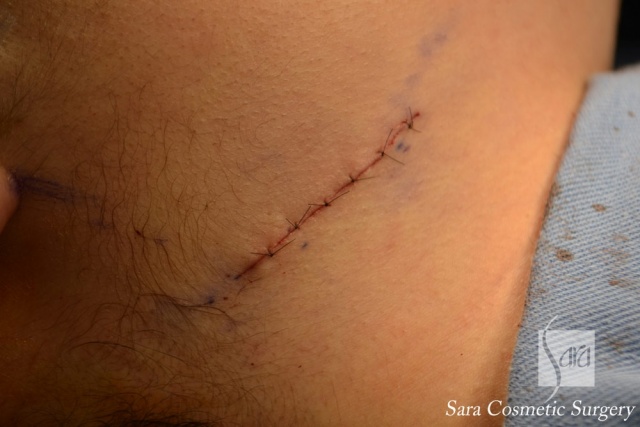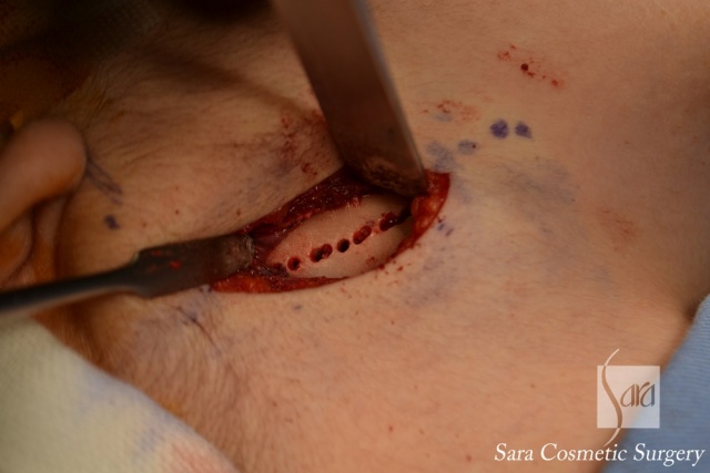 エラ骨切りはエラの外側を約3~3.5cm切開して脂肪層、筋層を押分けて骨を露出します