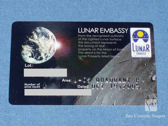 月の土地を1エーカー(1200坪)買いました、1エーカーはサッカーグランド1つ分だそうです。1エーカーで3,200円でした。案外安いのか、高いのか分かりませんが、将来もしかしたら・・・と思い購入しました。申し込みから5ヶ月ほどで権利書やカードも届きました。なかなか心擽られる、権利書類です。たまたまテレビで月の土地の購入法を見てすぐに調べて申し込みました。販売元はアメリカルナエンバシー社で日本での販売はルナエンバシージャパンが行っています。