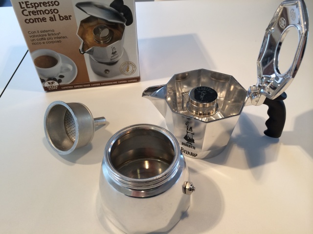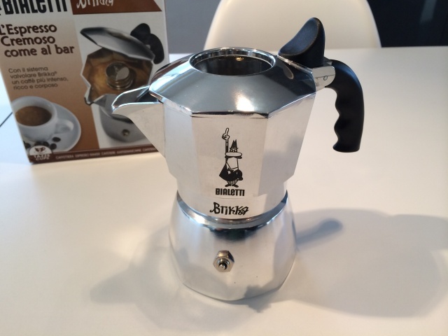 エスプレッソやカフェラテを家で飲みたくて直火のエスプレッソマシンを入手しました。イタリアの製品です。イタリアでは直火のエスプレッソマシンが一般家庭に普及しているみたいでマキネッタと呼ばれています。その中でも一番の普及率を誇るのがBIALETTI(ビアレッティ)社製のモカ・エキスプレスです。そのBIALETTI社から新型のBRIKKA(ブリッカ)という製品が発売されていたのでそちらを入手しました。こちらは2CUP用(実質1人分=100cc位)です。2CUP用は現在日本の正規代理店での取扱がなかったので個人輸入しました。なぜわざわざ個人輸入までして2CUP用を購入したかといえば、マキネッタは作るエスプレッソのカップ数で製品が異なりますので4CUP分作りたかったら4CUP用の製品を買わないといけません。4CUPの製品で2CUP分だけ作るという事が出来ないんです。このへんが融通が効かなくて不便な製品ですが・・・本来はエスプレッソマシーンが一番手っ取り早いのですが、メンテとかめんどくさそうですし、置き場も取るし、色々調べていたら良く壊れるみたいなので・・・諦めました。