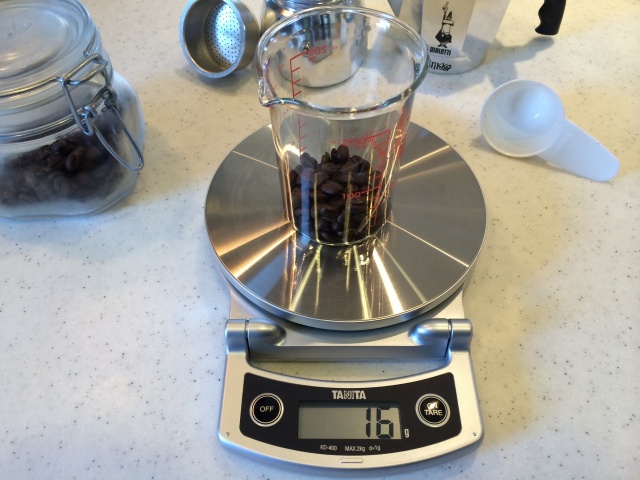 豆は約16g計量器できっちり計ります。この量が丁度フィルターに入る量です。