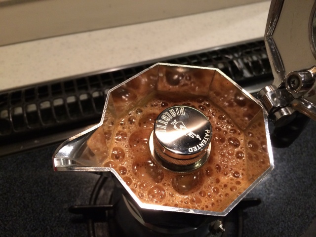 3分ほどでアッパーパーツのバルブからエスプレッソが抽出されて来ます。上手く行くとクレマが出来ます。