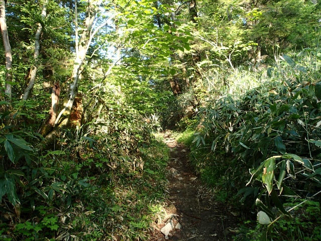 登山始めはなだらかな樹林帯、朝日が出てきてテンション上がります。