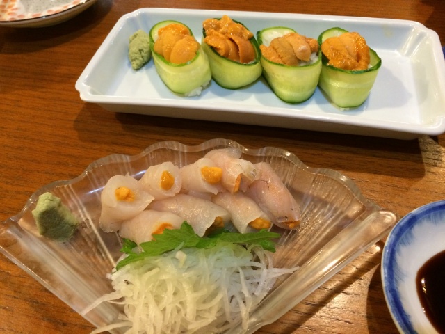 うにのきゅうり巻とうにのヒラメ巻~贅沢にうにもっさりです。