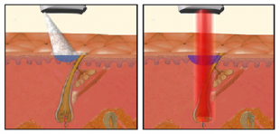 レーザー脱毛はレーザー光を照射することにより、表皮を損傷することなく毛包のみを選択的に破壊する脱毛法です