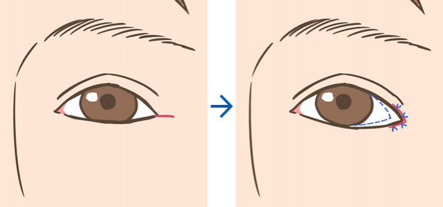 目尻側の皮膚、筋肉、結膜に切れ込みを入れ皮膚と結膜を上下で縫い合わせて目尻側に広げます。
