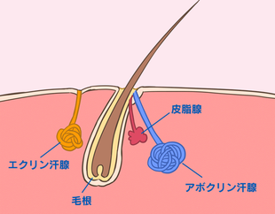 ワキガのあの嫌なニオイは、アポクリン汗腺や皮脂腺からの分泌物に含まれるタンパク質や脂肪酸などが、皮膚表面に繁殖する細菌により分解されることで発生すると考えられています。中でも主要因とされるのはアポクリン汗腺からの分泌物です。アポクリン汗腺は皮膚の深い部分、脂肪組織からなる皮下組織に位置し、毛穴を通して乳白色の粘り気のある液体を分泌します。液体の成分は、中性脂肪・脂肪酸・蛍光物質・色素など。これらが、ニオイと汗ジミの原因と考えられています。アポクリン汗腺はわきの下や外耳・乳輪周囲・外陰部・肛門部の周囲など、硬い毛の生えている限られた部分に発達しています。その腺体はエクリン汗腺の実に10倍もあり、大汗腺と呼ばれています。アポクリン汗腺はエクリン汗腺と違って機能的な役割はほとんどなく、緊張したり、興奮した時に交感神経の働きによって分泌されます。 また、アポクリン汗腺も含めて、汗の分泌量が多い状態を多汗症と言います。何ミリリットル以上の汗をかくから多汗症というものではなく、自覚的な要素の多い病名ということになります。 これらの症状は、汗腺の除去、または、働きを弱めるという方法で治療をいたします。