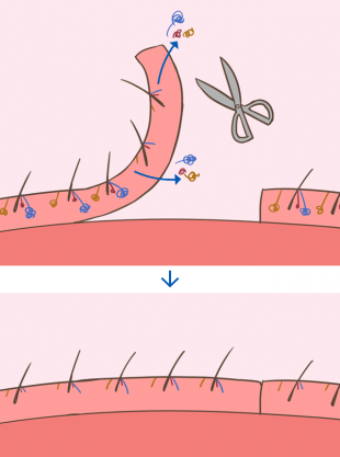 わきの下中心部のシワに沿って1カ所もしくは2カ所、約5~8cm切開します。切開部から皮膚をひっくり返す様に反転します。剪刀(ハサミ)にてアポクリン汗腺・エクリン汗腺・皮脂腺を切り取ります。傷口を丁寧に縫いあわせて終了です。